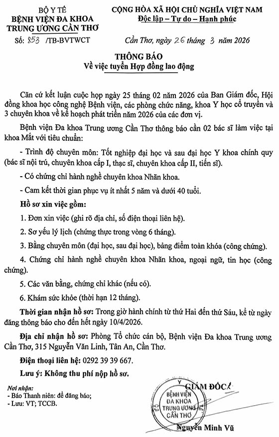 Bệnh viện Đa khoa Trung ương Cần Thơ thông báo cần 02 bác sĩ làm việc tại khoa Mắt, cụ thể như sau: