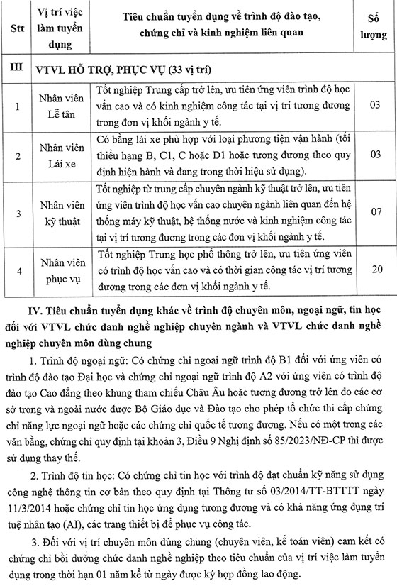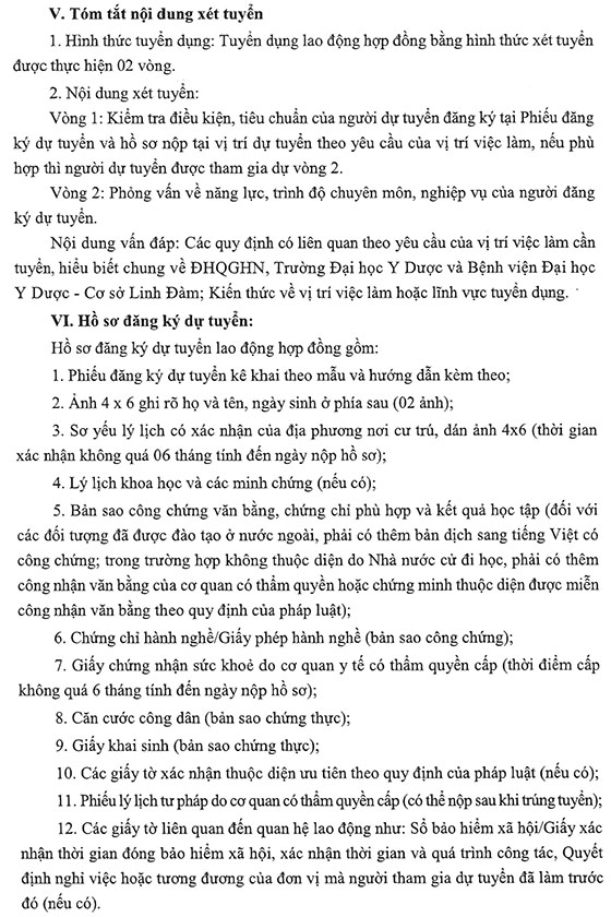 Căn cứ Công văn số 689/ĐHYD-TCCB ngày 12/03/2026 của Hiệu trưởng Trường Đại học Y về việc ban hành Kế hoạch tuyển dụng lao động hợp đồng Bệnh viện Đại học Y Dược – Cơ sở Linh Đàm năm 2026; Căn cứ Công văn số 5749/ĐHQGHN-TC&TT ngày 11/11/2025 của Giám đốc Đại học Quốc gia Hà Nội về việc tiêu chuẩn tuyển dụng đối với một số chức danh nghề nghiệp hạng IV; Bệnh viện Đại học Y Dược – Cơ sở Linh Đàm thông báo tuyển dụng như sau: