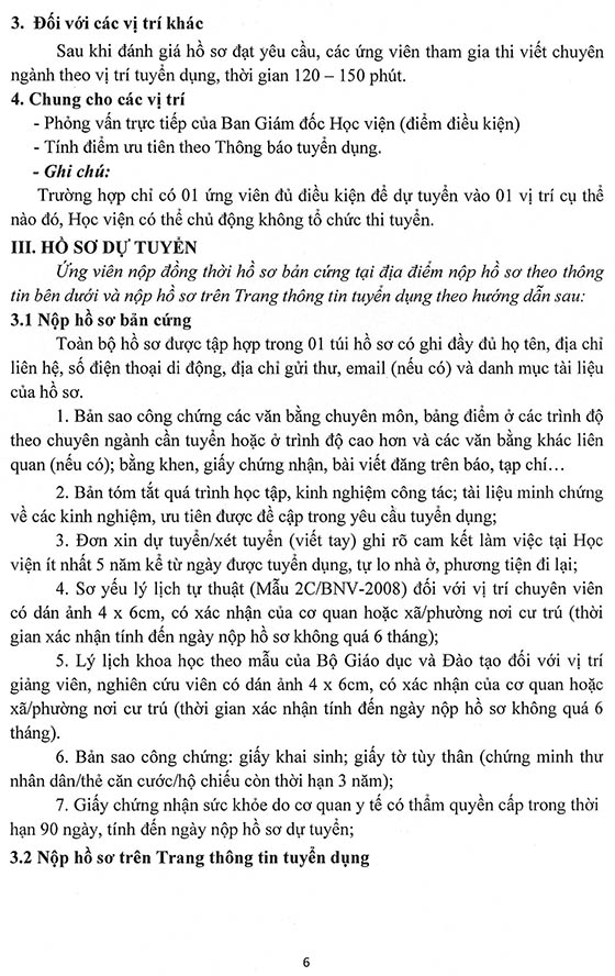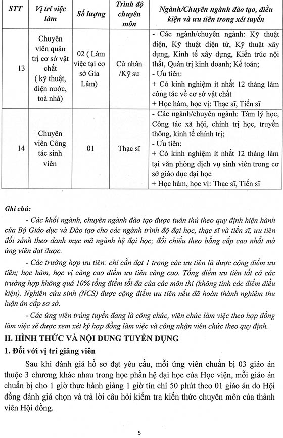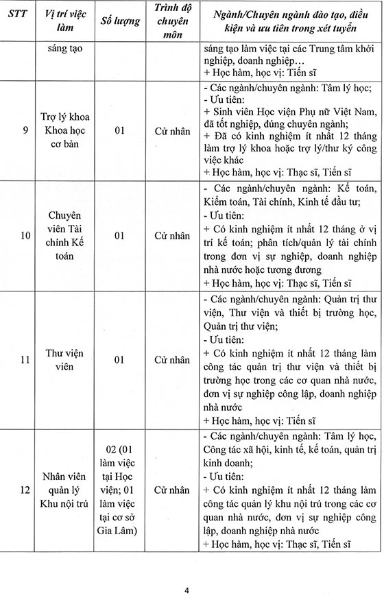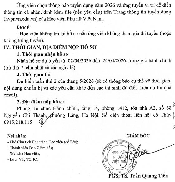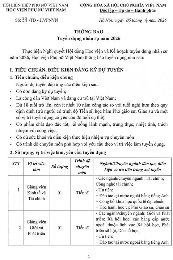 Thực hiện Nghị quyết Hội đồng Học viện và Kế hoạch tuyển dụng nhân sự năm 2026, Học viện Phụ nữ Việt Nam thông báo tuyển dụng như sau: